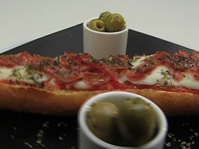 Вкусная пицца за пять минут.Состав:томатная паста — 4 столовых ложки;оливки — 30 штук;сыр Моцарелла — 1 шарик;ветчина — 100-150 гр;багет — 1/2 багета;орегано, черный перец, соль, оливковое масло — по вкусу.
