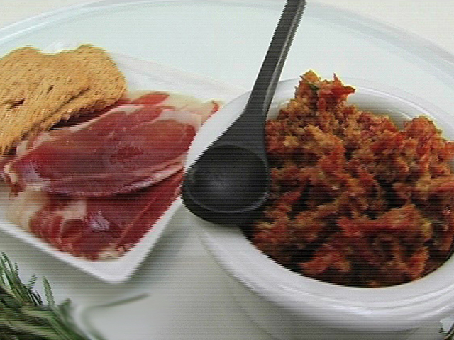 Вкусная закуска с помидорами.Состав:сущеные помидоры — 15-20 штук;каперсы — 2 столовых ложки;оливки — 3 столовых ложки;чеснок — 1 столовая ложка;сок половины лимона;тосты — 3 уксочка;ветчина — 3 кусочка;горчица — 1/2 столовой ложки;масло, розмарин — по вкусу.