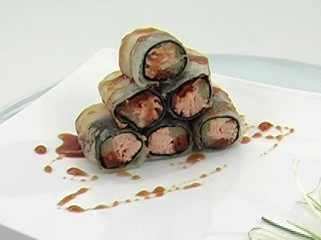 Рулеты из лосося с соевой карамелью.Состав:сушеные помидоры — 2 штуки;нори — 3 полоски;рисовая бумага — 3 штучки;оливковое масло — 1 столовая ложка;вода — 50 гр;лимонный сок — 50 гр;соевый соус — 50 гр;сахар — 50 гр;лук — 1 стручок;лосось — 3 дольки.