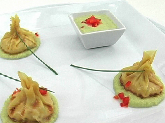 Новое блюдо из лосося с авокадо.Состав:простое тесто — 3 кусочка;рыбный бульон — 50 гр;сладкий перец — 1 штука;лук — 1 штука;сок половины лимона;белое вино — 1 столовая ложка;авокадо — 1/2 штуки;лосось — 30 гр;соевый соус, оливковое масло — по вкусу.