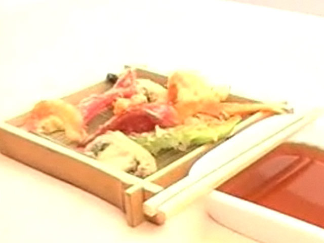 Рецепт приготовления темпуры.Состав: морковь — 1 штука;капуста цветная — 1 штука;грибы — 1 штука;креветки — 5 штук;перец — 1 штука;яйцо — 1 штука;имбирь, рисовый уксус, соевый соус, саке, сахар, мука.