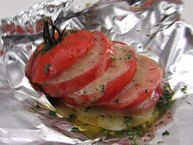 Горячая закуска к сытному обеду.Состав:сыр — 4 кусочка;помидор — 1 штука;петрушка, лук, соль, перец, оливковое масло — по вкусу.