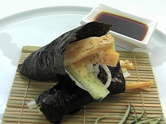 Аппетитные пирамидки из омлета и тыквы внесут разнообразие в ваше меню.Состав:омлет — 1 штука;огурец — 1 штука;васаби — 1 чайная ложка;сушеная тыква — 50 гр;рис — 100 гр;нори — 1 лист;соевый соус — по вкусу