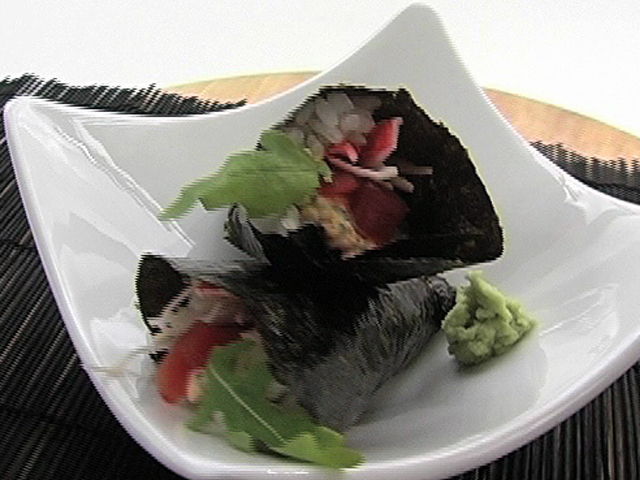 Фирменное блюдо из пряного тунца.Состав:нори — 1/2 листа;тунец — 30 гр;крабовые палочки — 1 палочка;сливочный сыр — 1 столовая ложка;зеленый лук — 2 чайные ложки;рис — 100 гр;кунжут, пряный соус «Кимоши» — по вкусу.