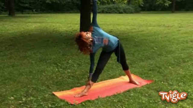 Инструктор Маруся показывыает, как правильно выполнить уттхиту триконасану.